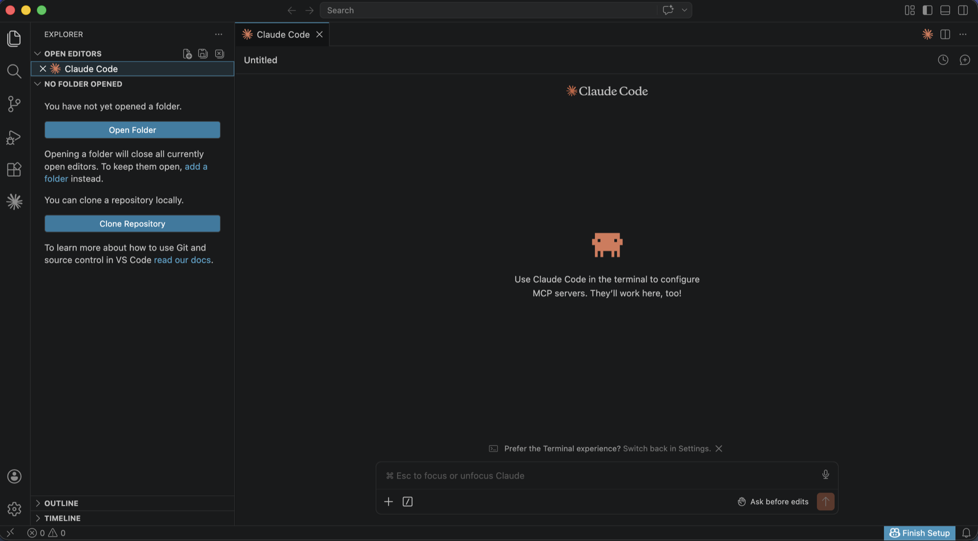 Abra o VS Code, pressione Cmd+Shift+P, digite "Claude Code" e selecione "Focus on View". No chat, digite: