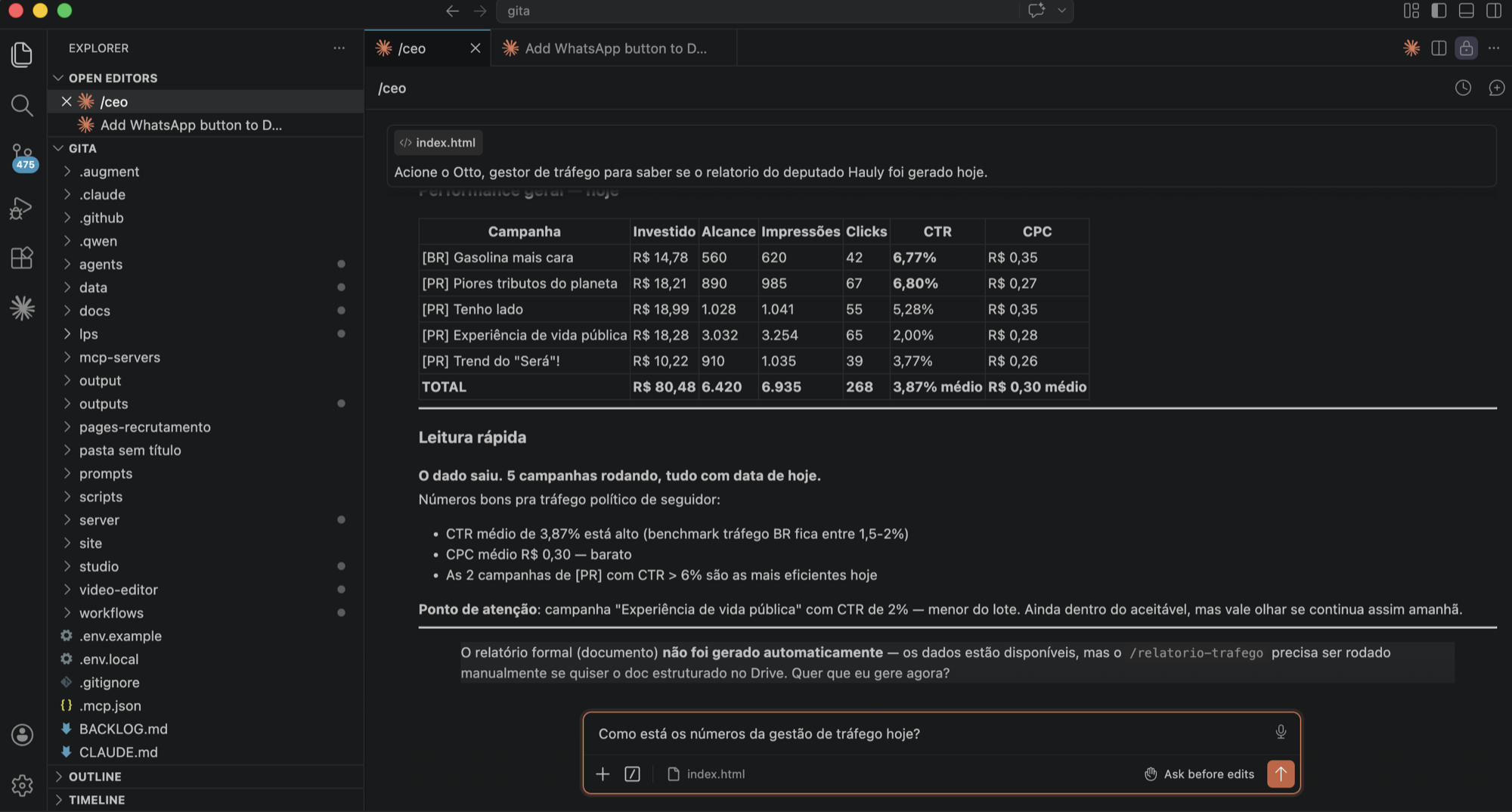 Digite /metricas-semanais. Cole os números da semana (vendas, leads, conversão, faturamento, o que tiver). O Claude transforma em dispatch executivo.